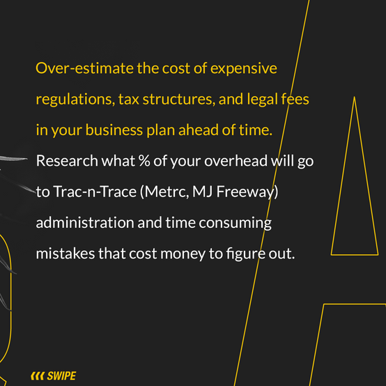 Be sure to over-estimate the cost of expensive regulations and tax structures and legal fees into your business plan ahead of time. If you're in a Trac-n-Trace (Metrc, MJ Freeway, etc.) state, research what % of your overhead will go to Trac-n-Trace administration and time consuming mistakes that cost money to figure out. Interview multiple tax consultants about what your tax burden will look like in each state you plan to operate, if you are plant-touching. Talk to other successful business owners in the state with similar business models as you plan to deploy, and and ask them if they'd be willing to share what they spend on things like legal fees and compliance.